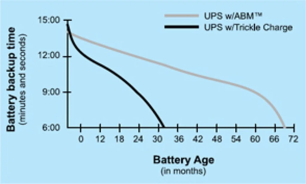 Battery service life is a major contributor to UPS reliability. Since batteries are electrochemical devices, their performance gradually decreases over time. Premature wear-out means higher costs interms of replacement labour and shorter service cycle. A worn battery entails a risk of unexpected load loss. In normal UPS operation, backup power is needed only occasionally and the battery ‘wearing’ rate depends strongly on how the full charge is being maintained. Excess charging is detrimental under any operating circumstances.